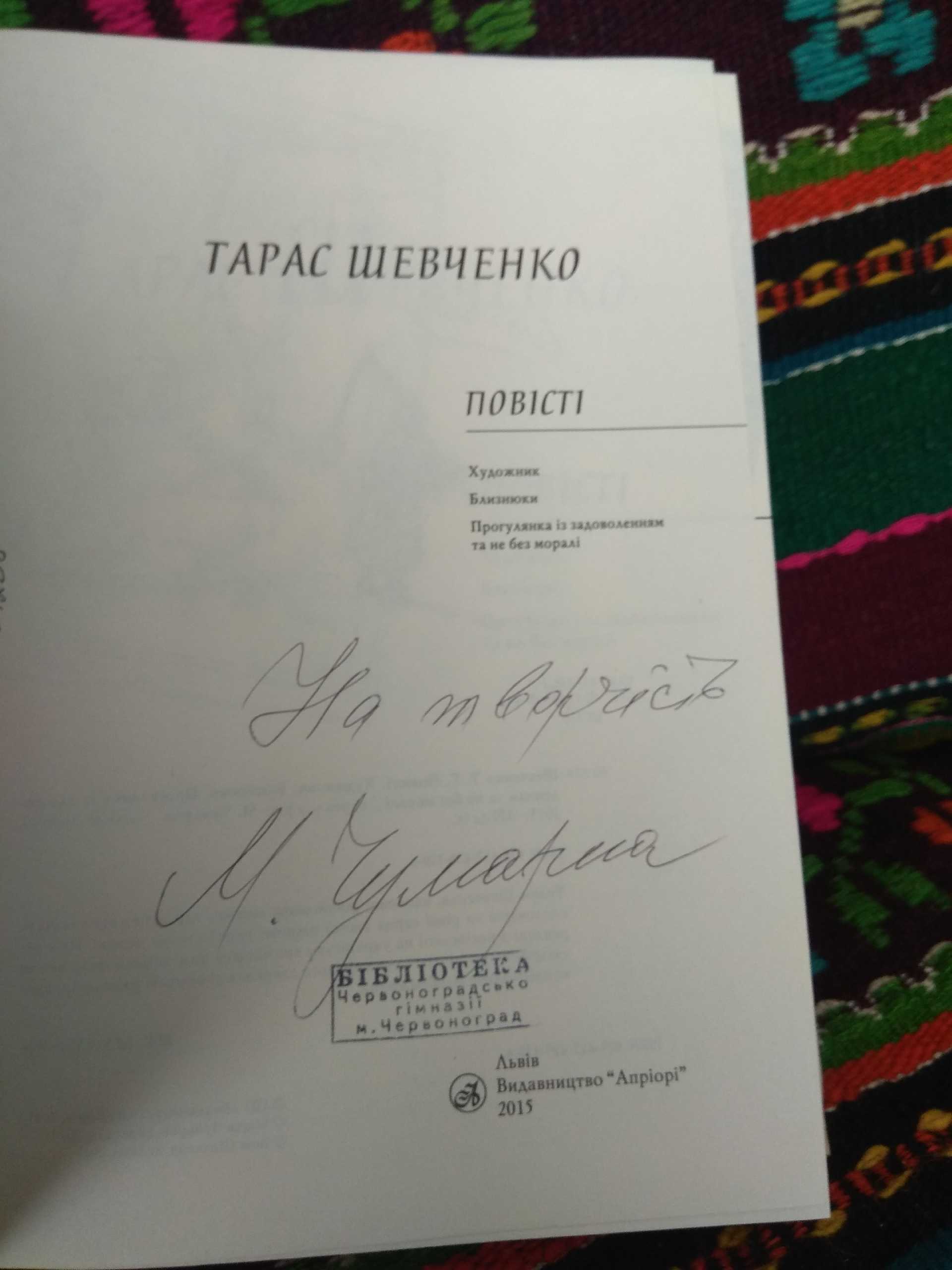 - Твори Шевченка написані російською мовою, але пережиті і відчуті, висловлені на рівні серця своєю рідною, українською мовою. І вашій увазі переклад повістей Марією Чумарною. Книга теж із автографом.